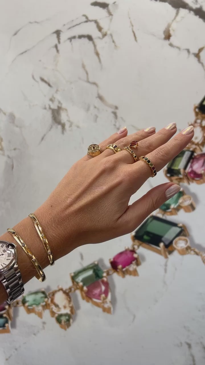A aliança de turmalinas coloridas é como um passeio por um jardim de gemas preciosas: tons que se entrelaçam em perfeita harmonia, cada um com sua própria personalidade. Verde, rosa, amarelo, azul… um arco-íris lapidado em ouro que transforma o ato de usar um anel em uma declaração de estilo e liberdade.