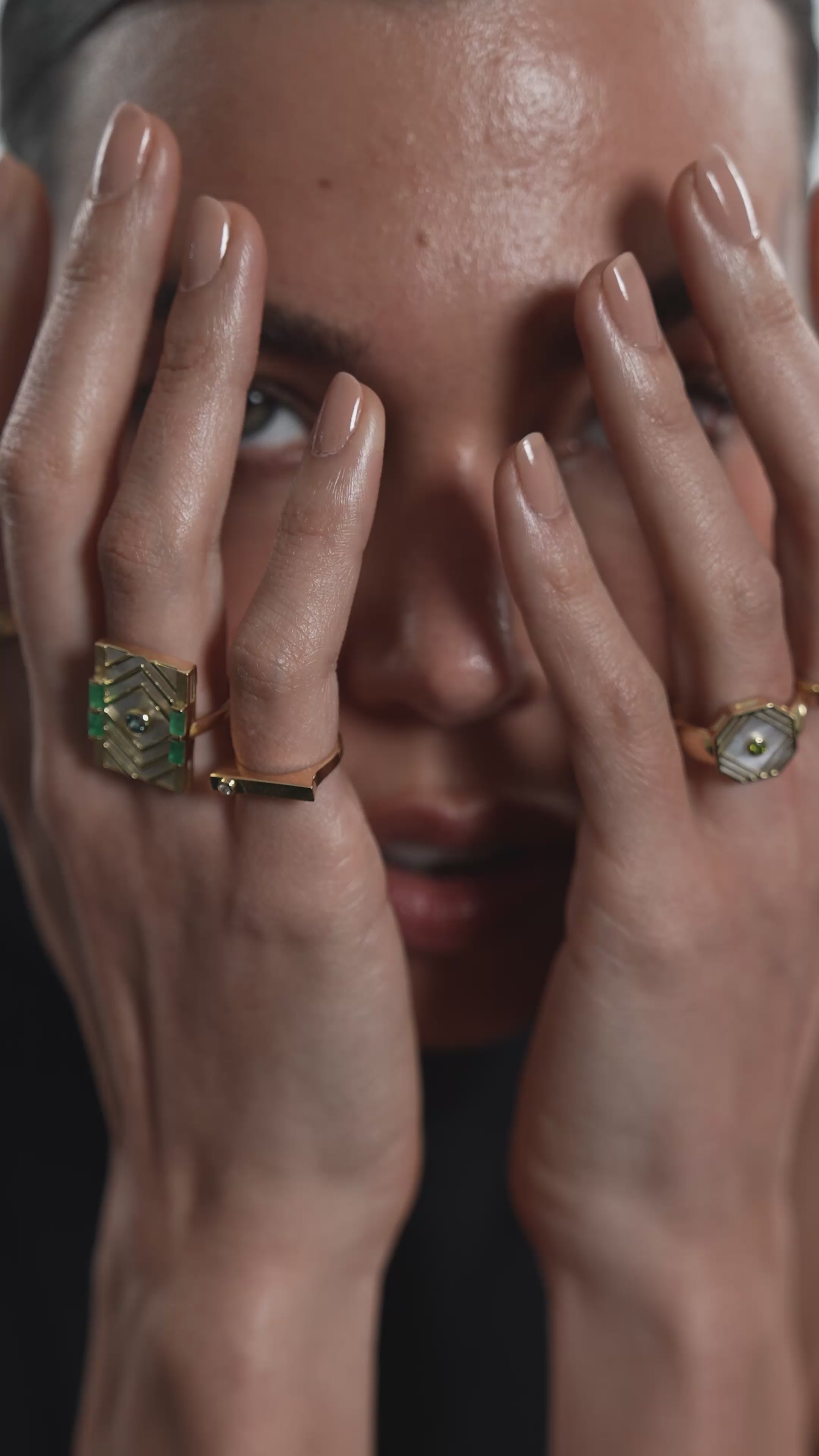 As linhas geométricas, construídas em camadas, criam um jogo de profundidade que abraça o brilho suave da madrepérola, enquanto a esmeralda central ilumina o anel com um toque vibrante de cor.