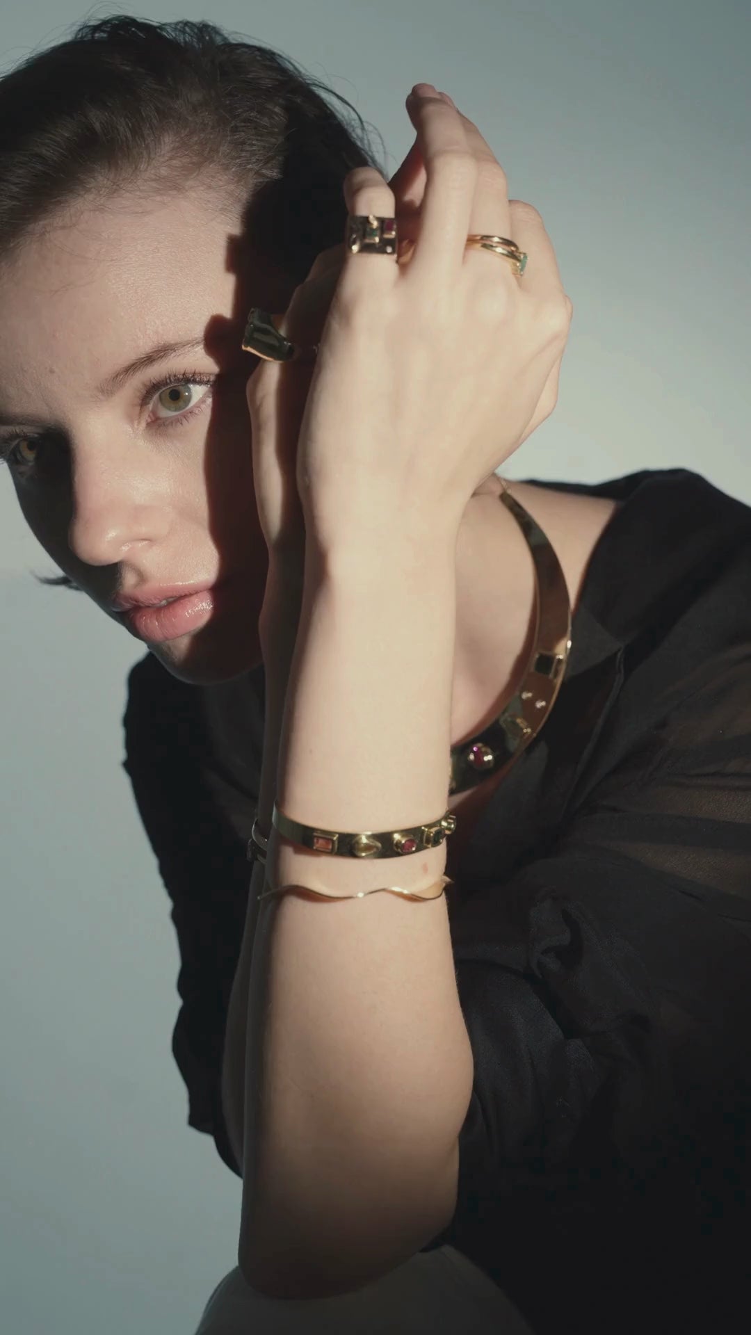 Este colar rígido traduz força e sofisticação em uma única peça. O dourado forma a base escultural que abraça o colo com imponência, enquanto turmalinas em tons vibrantes – rosa, verde e azul – se alternam com diamantes para criar um contraste hipnotizante. É uma joia que não pede licença para brilhar: chega e ocupa seu lugar.